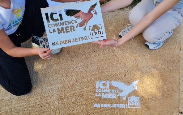 Un pochoir de sensibilisation sur la problématique des pollutions amont/aval a également permis d’outiller les équipes et des exemplaires de "L'oiseau Mag" hors série "mer&littoral" distribués.